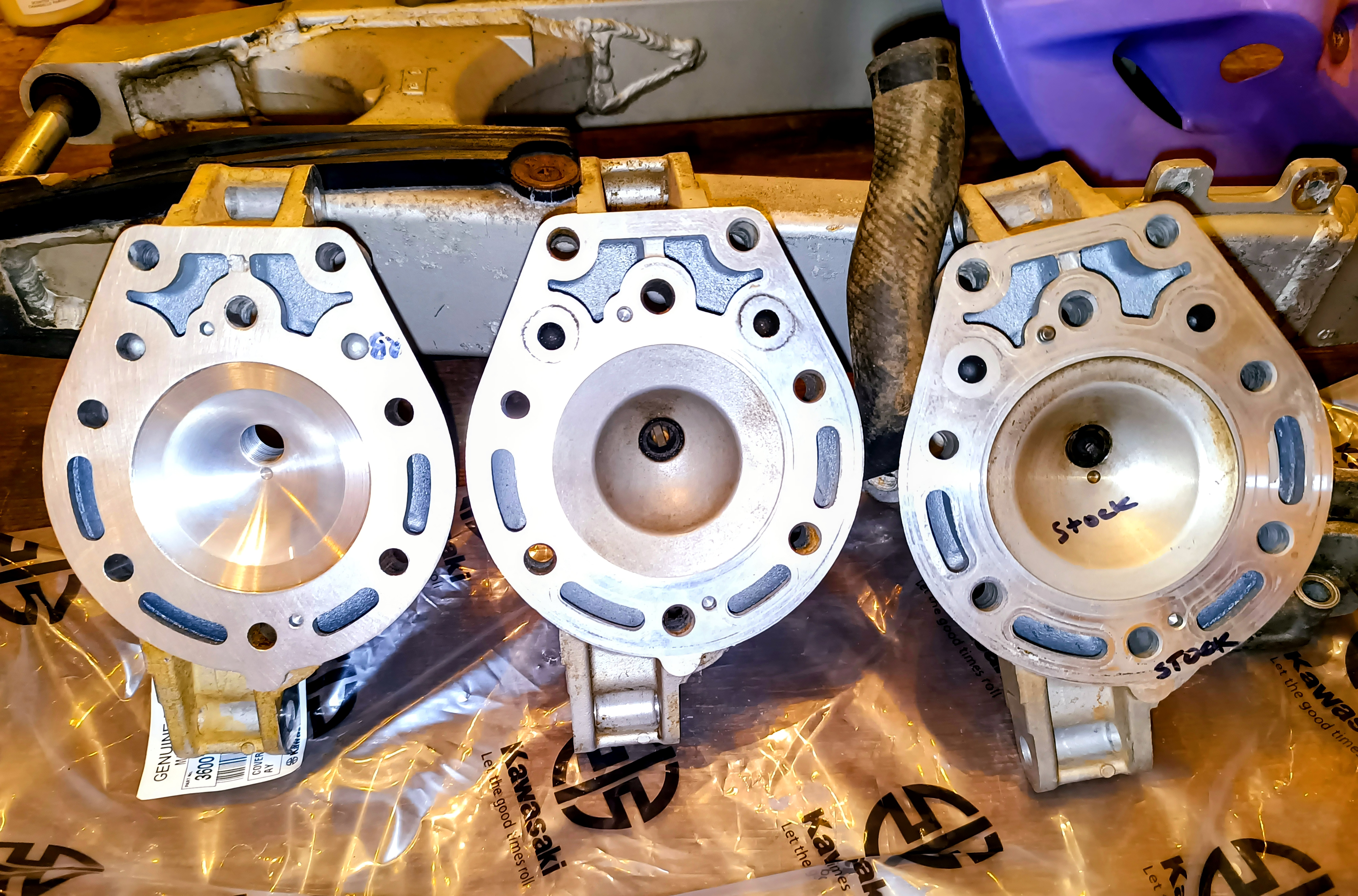 The SR squish band height tapers off to virtually nothing, I can catch my fingernail on the step down from the gasket surface to the squish band area, but it is very miniscule, perhaps half that of the RB head and a tiny fraction of what the stock KDX head has (which has a very tall squish clearance).