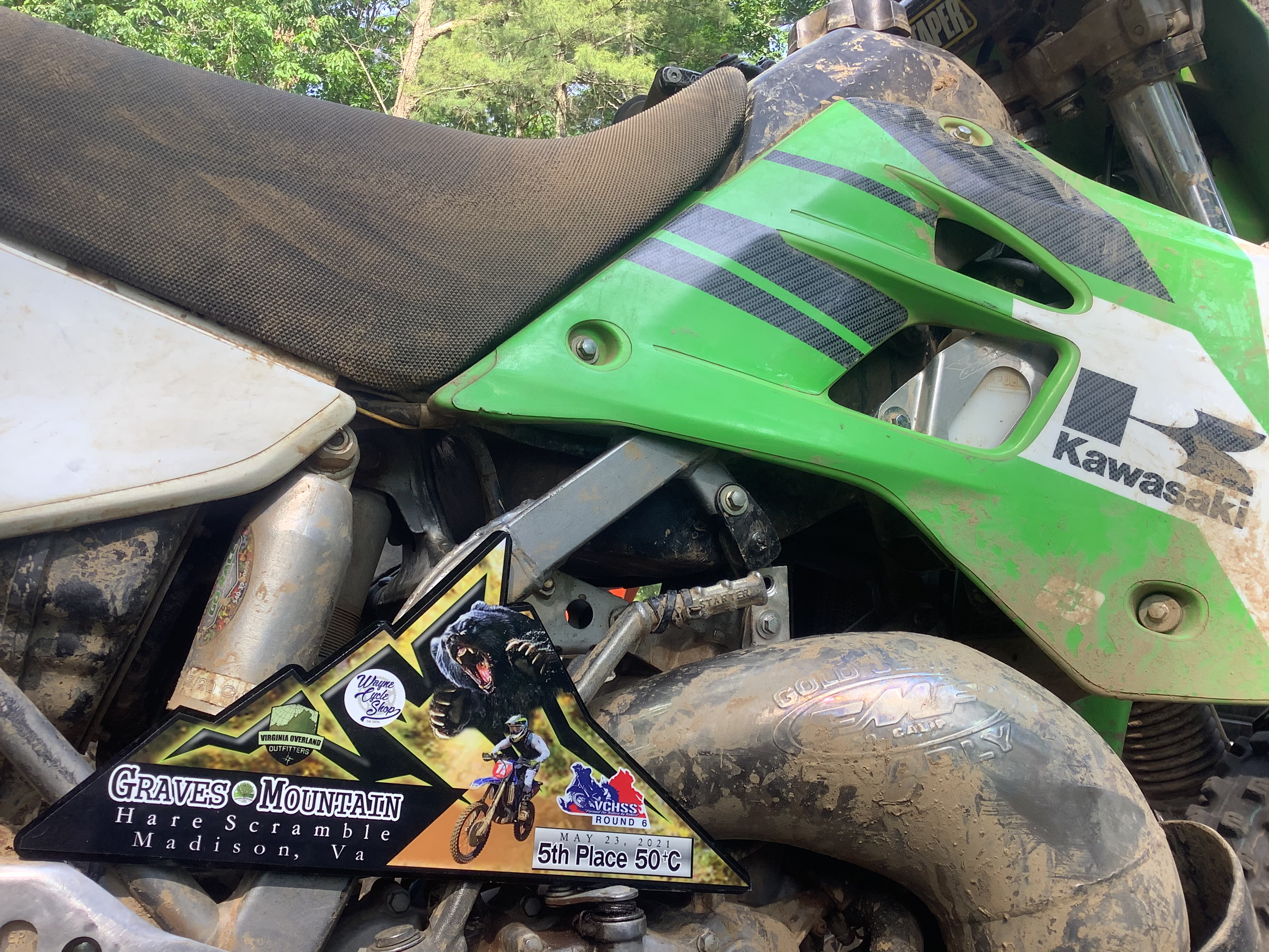In the end I managed three laps and was the last rider in my class on the lead lap. There were twenty-two starters and two DNFs. Scoring later showed me 7th on my first and 5th for the final two. Even got a neat fifth place trophy to hang in the shop. I’ll take it. Wished I’d had this KDX running this well at the previous race though!